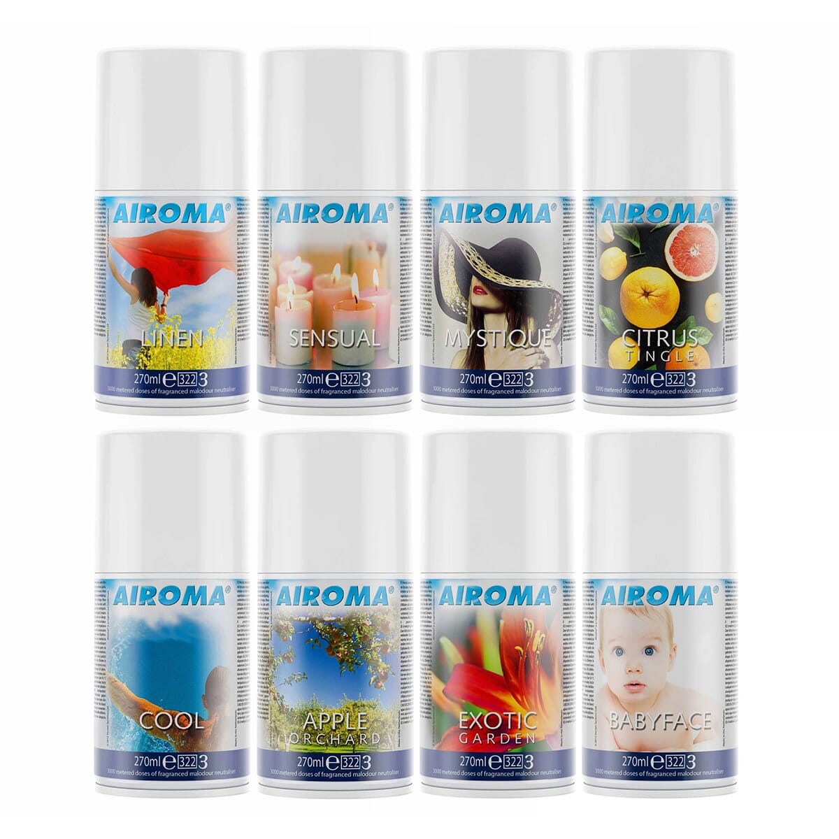 The high quality Airoma refills provide long lasting fragrances to suit all preferences. The two piece actuator on our Airoma dispenser aerosol nozzle ensures that fragrance is dispersed widely to achieve optimum coverage. and the automated timer lets you set the intervals to suit the area and traffic.